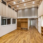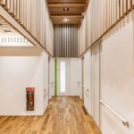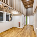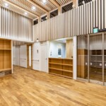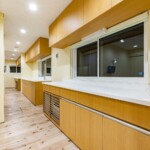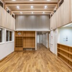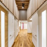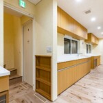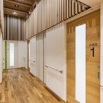 1階は待合室、診察室をはじめ診療部門を集約し、2階はスタッフの休憩室となっている。待合室、中待合室は壁、天井共に杉のルーバー材を使用し、温かみのある空間で患者さんはゆっくりと診察を待つ。