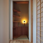 1階の東側には景観を活かすためにLDKと茶室を配置。茶室は、広間席(8畳)を確保し、東側外部には茶庭も広がる。床の間、書院、欠月窓、障子、襖、空調吹出口、水屋等のディテール(詳細部)にもクライアントのこだわりを実現させた。