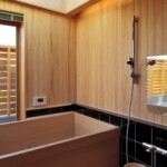 夜になると東側に開けた空に月が浮かぶ。その月を眺めるために浴室は2階のバルコニーに面して配置。バルコニーには目隠しルーバーを設置し、外部からの視線にも配慮。月の高度を考慮して浴室の窓、トップライトの設置位置、バルコニーの目隠しルーバーの高さを設定してある。浴室はヒノキ張で浴槽もひのきの浴槽を採用。日ごろ仕事で疲れた心と身体をリフレッシュしてくれる至福の時間を満喫できる。
