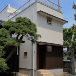 本堂の庭となってた狭いスペースに夫婦と子供一人、そして犬6匹と暮らす為の住宅。自ずと要求諸室、面積をクリアする為には3階建ての計画となり、犬が走り回れるスペースとして屋上にドックヤードを設けた。